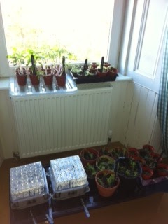 With the vegetable seeds in the propagators, our indoor south-facing windowsills have turned into a makeshift greenhouse. I've done two rounds of planting, first in the propagators, and then out into small pots. The next batch of seeds are in the propagators, but no signs of life yet. (Just a rogue slug next to Treacle's dinner bowl, yuck! Luckily our four legged hoover didn't spot it.)